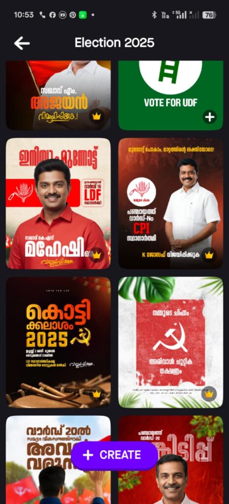 Explore a huge collection of templates customized for your region, culture, and language. From Onam, Eid, Diwali, Holi, Vishu, Christmas, and other festival themes to local business promotions, political greetings, shop opening banners, and daily wishes, you’ll always find the right design. Templates are available in Malayalam, Hindi, Tamil, Telugu, Kannada, Marathi, Bengali, Arabic, and English for maximum local impact.