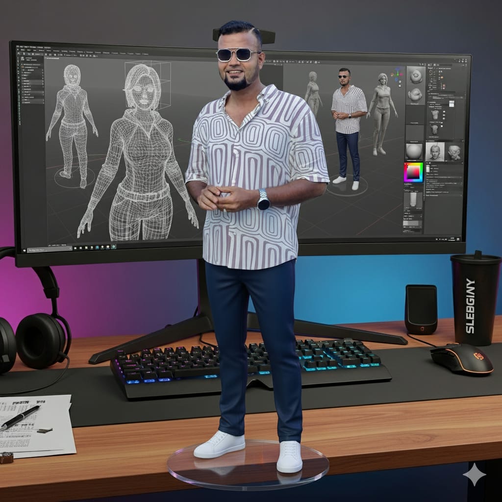 A curved gaming monitor in the background shows a 3D modeling process of this same figurine, with visible wireframe and render preview elements.