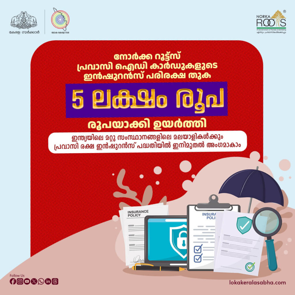 Norka ID Card holder will be eligible for Personal Accident Insurance coverage of Rs. 4 Lakhs for Death Cases and up to a maximum of Rs. 2 Lakhs for permanent/partial disability.